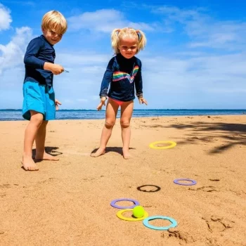 ¡RiBi: anillos, pelota y un sinfín de juegos! Este original juego incluye 6 anillos de colores (3 pares) y una pelota ligera. ¿El reto? Lanza la pelota y trata de hacerla caer dentro de los anillos colocados en la arena… o hazlo al revés: lanza los anillos e intenta rodear la pelota. También puedes flotar los anillos en el agua y convertirlos en «barquitos», crear un circuito en la arena o inventar tus propias reglas. RiBi tiene un diseño tan versátil como portátil. Los anillos son ligeros, flotan en el agua, y su compacto tamaño (anillos de 12 cm y pelota de 4 cm) permite llevar el set a cualquier parte: la playa, el parque, el jardín… ¡o el salón de casa!