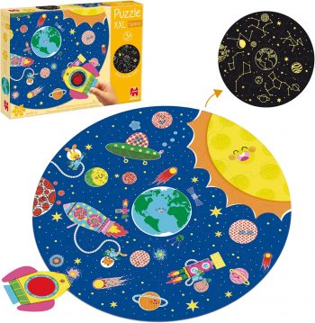 Puzzle XXL Espacio circular de 36 piezas para descubrir planetas, cohetes y constelaciones. Incluye piezas especiales que brillan en la oscuridad para aprender jugando desde los 3 años.