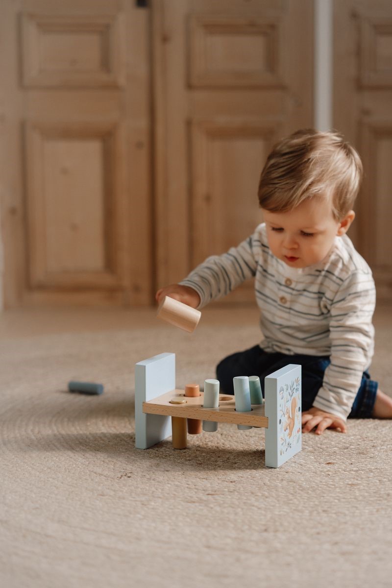 ¡Toc, toc, toc! Usa el mazo para golpear las 6 clavijas de colores en el banco de madera y explora la magia de bosque. ¿Terminaste de golpear? ¡Gira el banco y comienza de nuevo! Este es un muy buen ejercicio para el desarrollo de las habilidades motoras que seguramente mantendrá a tu pequeño entretenido por un rato.