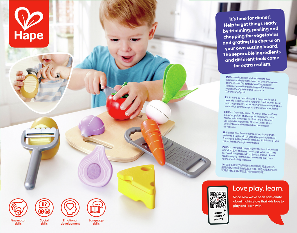 ¡Es hora de cenar! Ayuda a preparar la cena pelando y cortando las verduras o rallando el queso en tu propia tabla de cortar. Ingredientes separables y utensilios diferentes para darles mayor realismo.