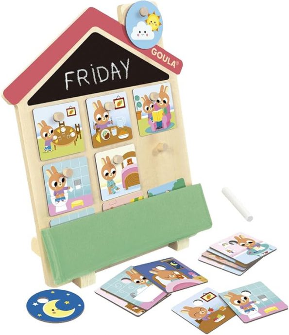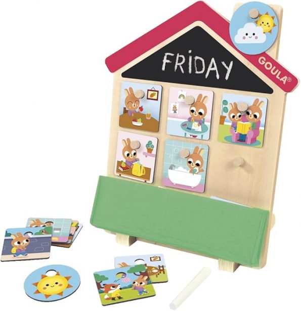 • Monta la casita de madera, escribe el día de la semana en la pizarra y organiza con tu peque las actividades que tiene que hacer durante el día antes de irse a dormir.