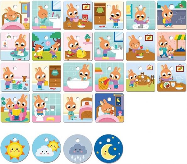 • El juego incluye 22 tarjetas con diferentes rutinas a lo largo del día: lavarse los dientes, ir al colegio, jugar, poner la mesa, hacer los deberes…