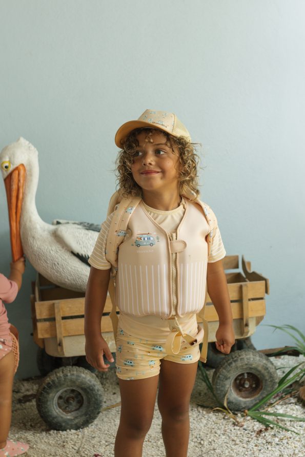 Descubre el adorable chaleco flotador de la colección Estrella fugaz que cuenta con una cinta con cierre de seguridad para colocar entre las piernas con el fin de que el chaleco no se salga por la cabeza, en caso de tirarse al agua de manera vertical o cuando, simplemente, está flotando en el agua. Además está protegida con neopreno para evitar rozaduras entre las piernas.