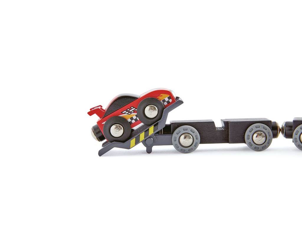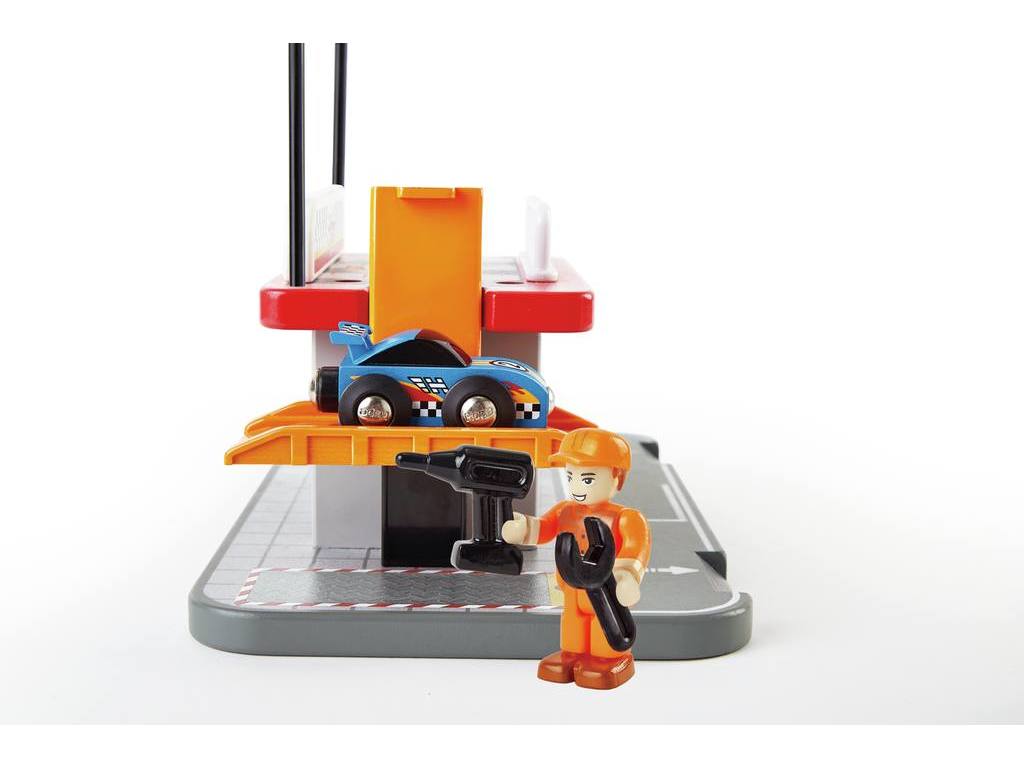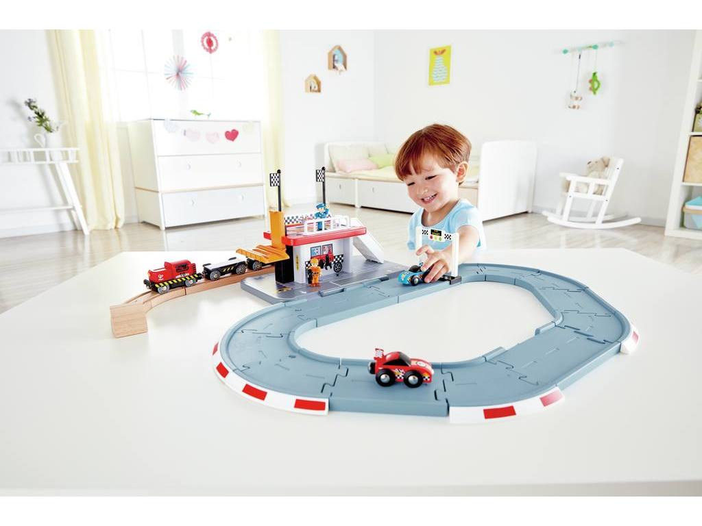 Añade una nueva y divertida dimensión a tus juegos de ferrocarril con esta pista y estación de carreras de coches. Transporta tus coches a la pista, ¡y compite en las carreras!