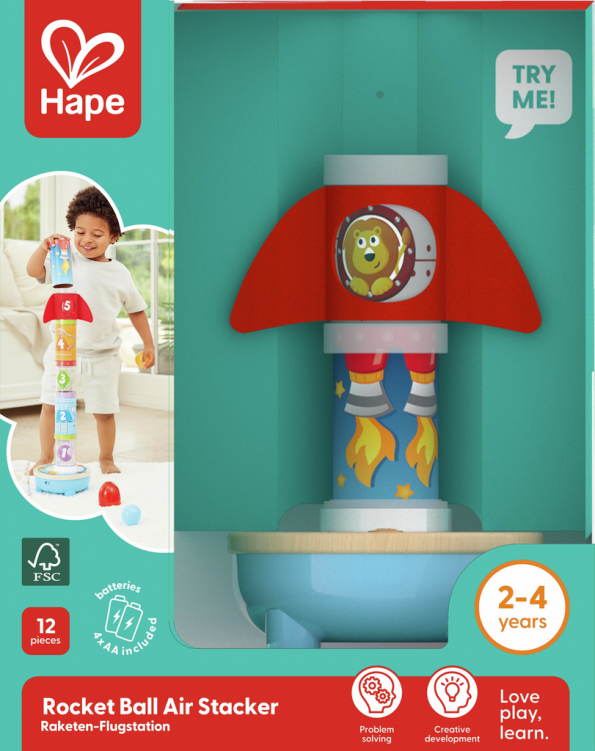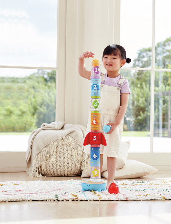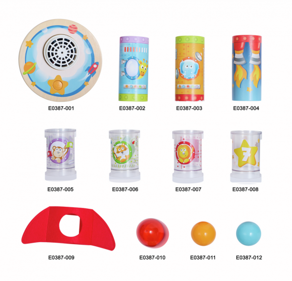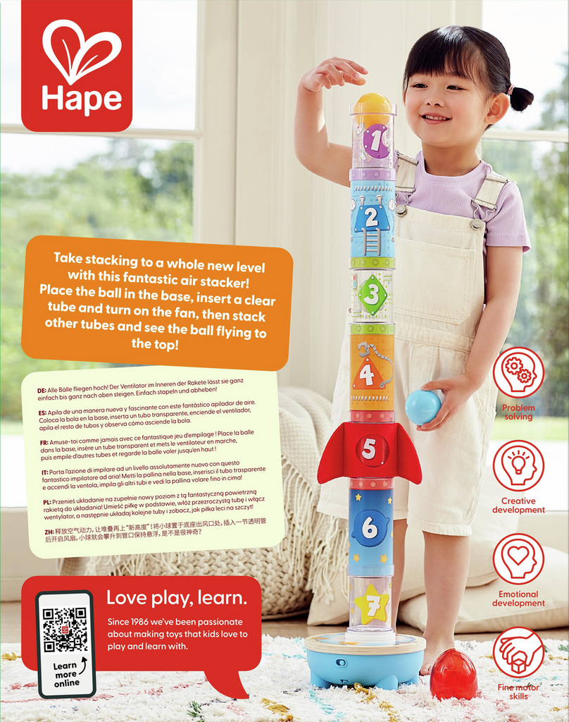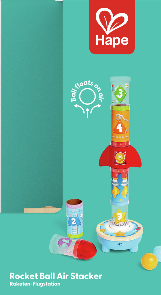 Genial diseño de cohete con lindas caras de animales. Incluye tres tubos de papel, cuatro tubos transparentes, dos bolas y una base de abanico. La base del ventilador soplará aire hacia arriba y empujará la bola hacia el interior de la torre. Cuando pones la tapa en la parte superior de la torre, la bola se hundirá hasta el fondo. Inspira curiosidad por la aerodinámica y la física. Fomenta el reconocimiento de animales, números, formas y motricidad fina Excelente para ayudar con el conteo temprano
