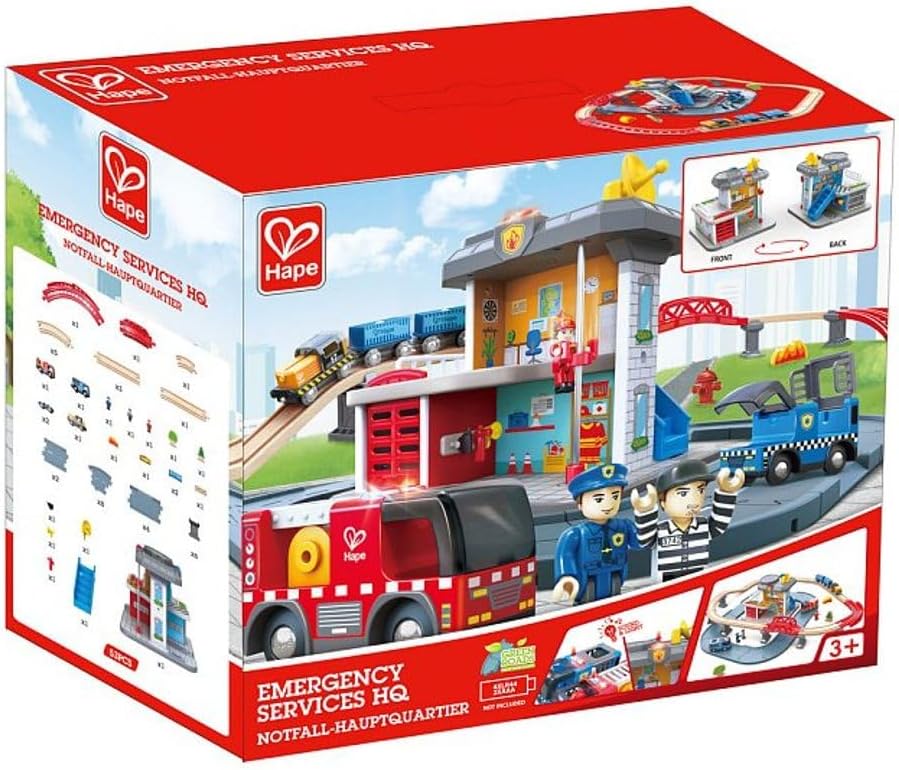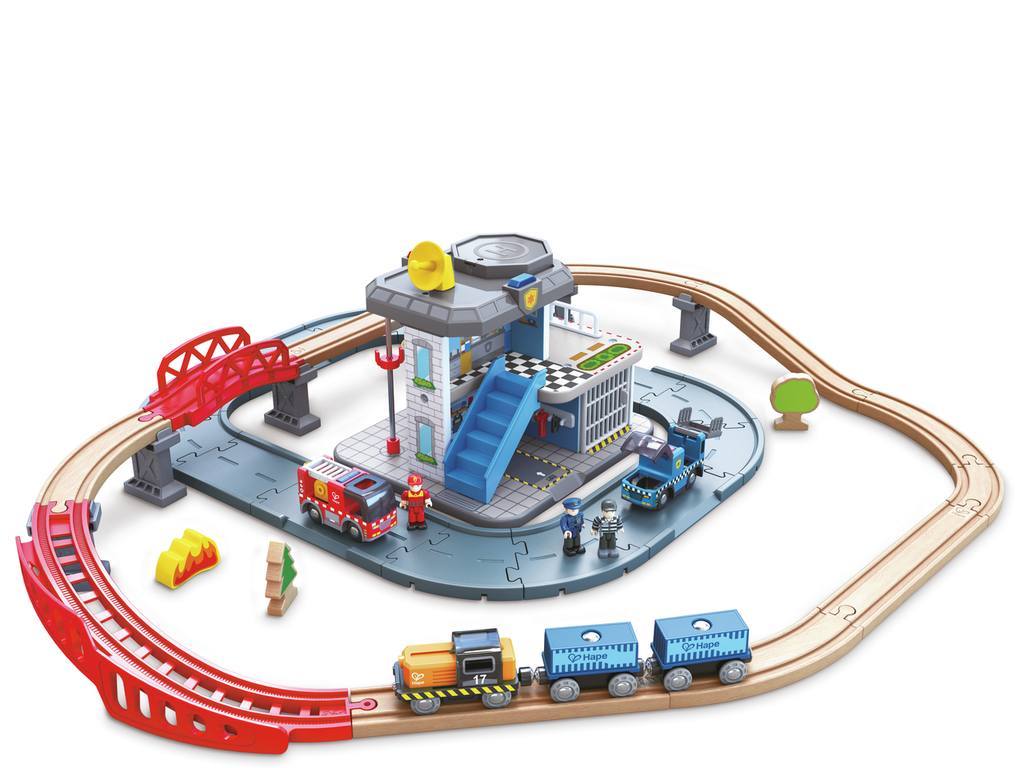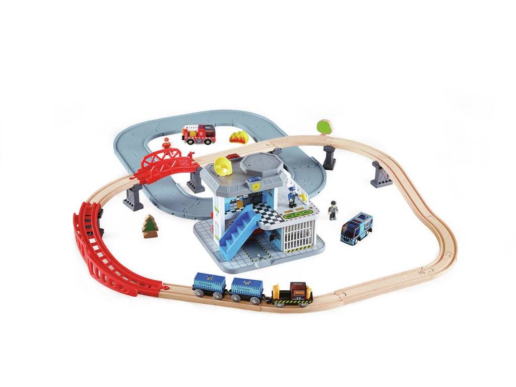 Mantén protegidas las carreteras y vías ferroviarias con este set de servicios de emergencia. Contiene vehículos y una estación de policía y de bomberos.