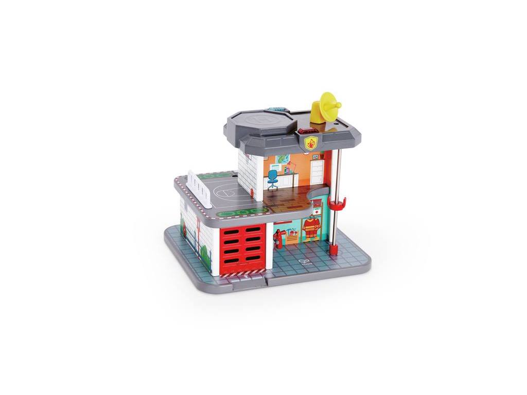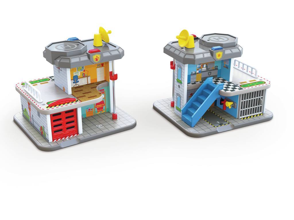 • 2 en 1: Estación de policía y de bomberos con caminos de de plástico vegetal sostenible, sirenas y luces.
