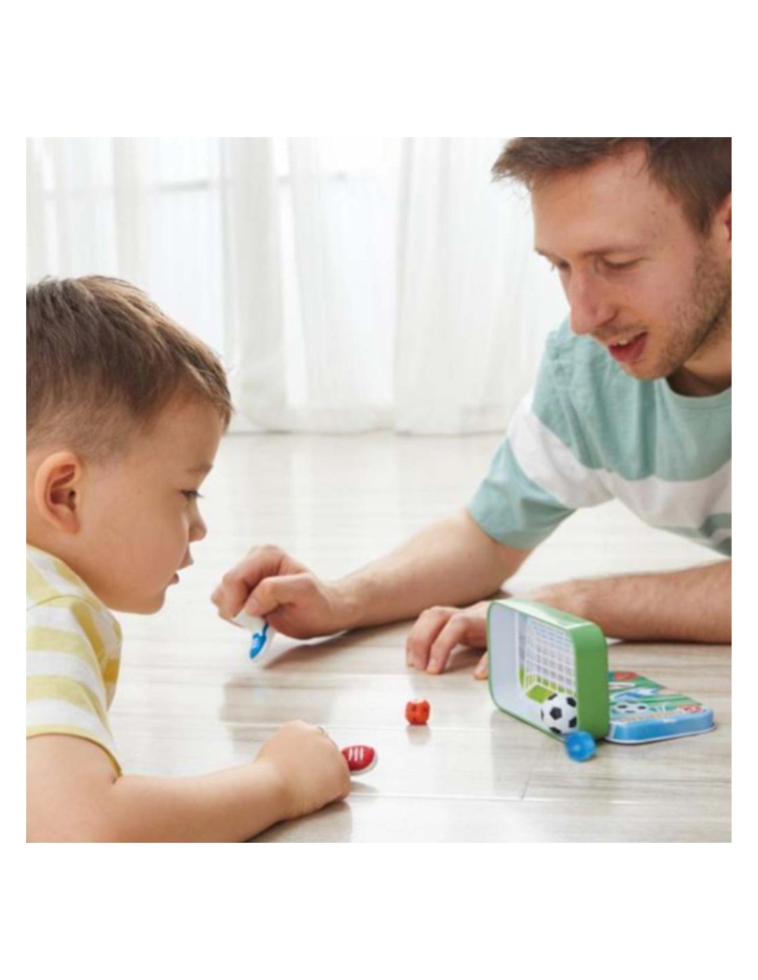 El juego incluye dos botas de dedo, una pelota y dos dados, que permiten crear diferentes formas de jugar. La propia base de la caja se transforma en portería, por lo que el juego se prepara en segundos.