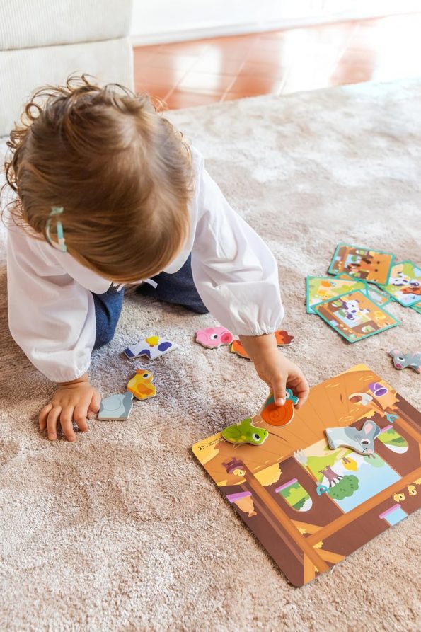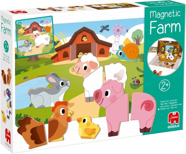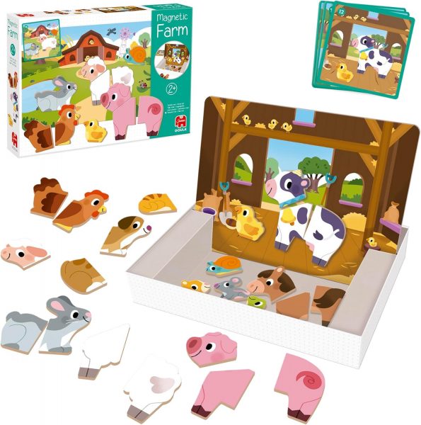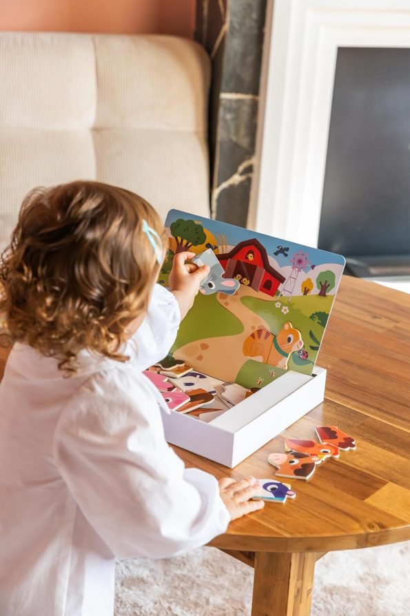 Cada figura de animal consta de 1, 2 o 3 piezas, que pueden ser ensambladas y reordenadas, optimizando las habilidades motoras finas del niño y su comprensión de cómo las diferentes partes se ensamblan para formar un todo. La temática de los animales de la granja no solo hace que el tiempo de juego sea divertido, sino también educativo, ya que los niños aprenden sobre diversos animales, sus características y la vida en la granja. Este set fomenta la creatividad y el juego imaginativo al permitir que los niños creen innumerables escenas e historias con las piezas magnéticas.