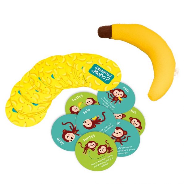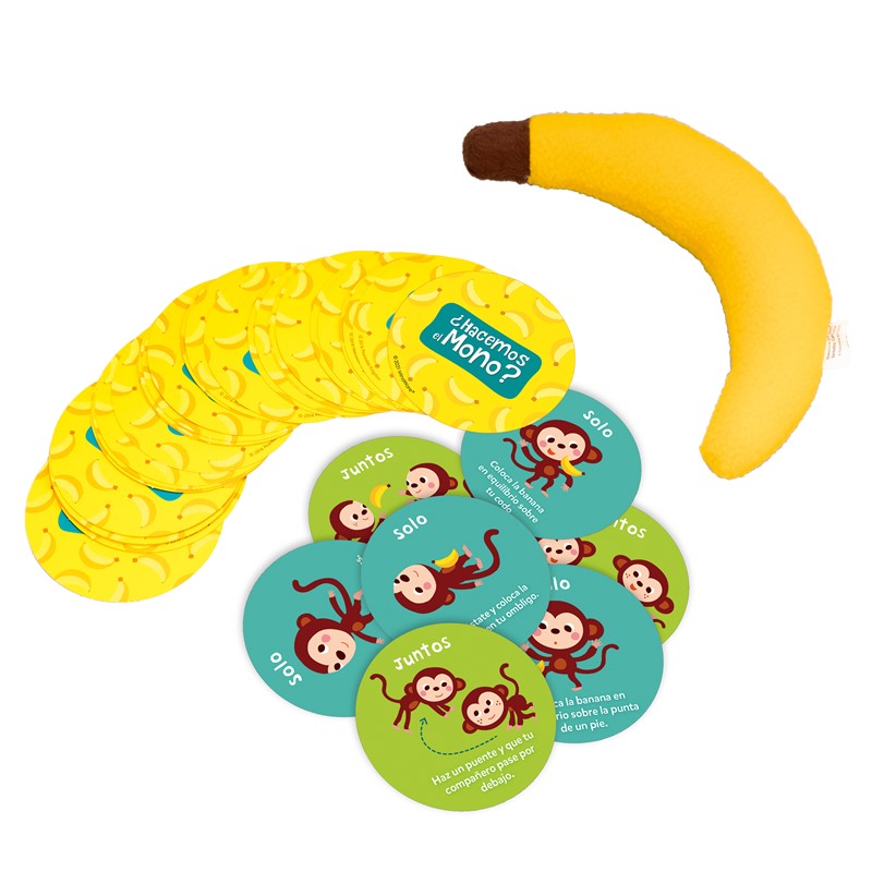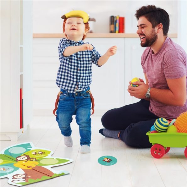 ¿Hacemos el mono? ¡Hará que tu hijo y tú os pongáis en movimiento! Un juego para jugar, aprender y reír juntos. Completa el árbol con los monos y después juega otra vez. Incluye un peluche de banana.