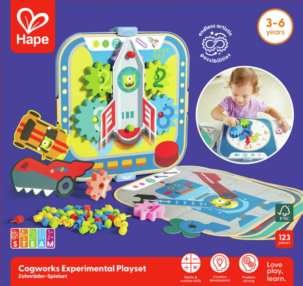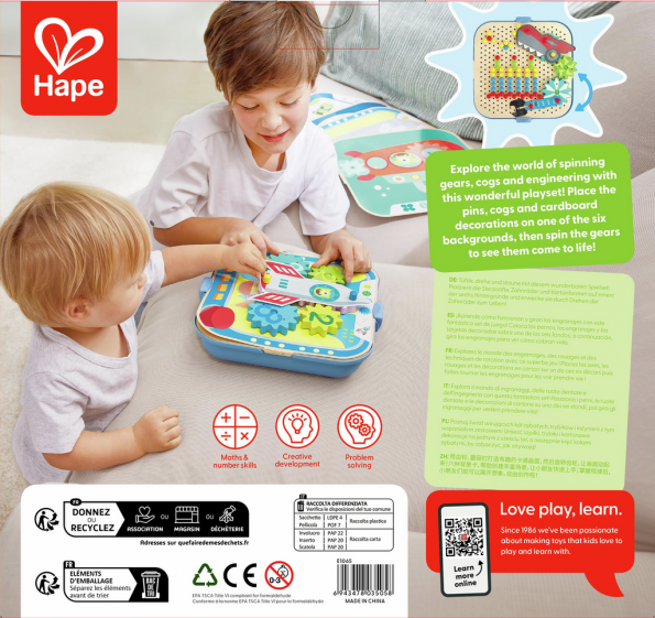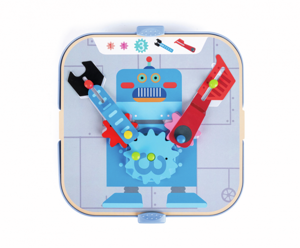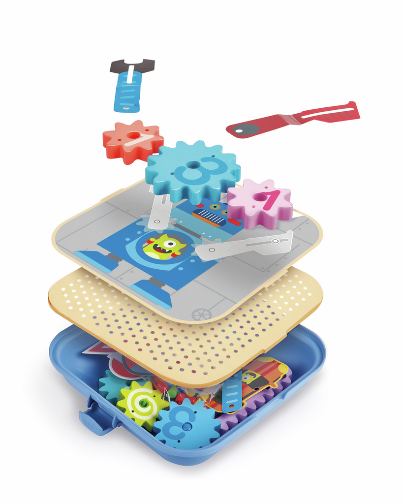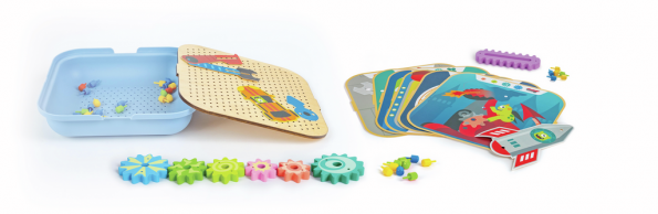 Set de juego de engranajes con seis diseños de fondo. Incluye seis engranajes, seis fondos de cartón, siete formas y figuras de cartón, 100 alfileres de colores y una caja de plástico con tapa de madera. Los diseños de fondo incluyen un paisaje urbano con un volante, un reloj, un dragón que echa fuego por la boca, un robot, un submarino que hace burbujas y un lugar de lanzamiento de cohetes. Perfecto para jugar con engranajes y fomentar la creatividad. Con los diferentes tamaños de las piezas los niños y niñas pueden aprender conceptos básicos sobre cómo funcionan los engranajes, la fuerza, la velocidad y las relaciones técnicas.