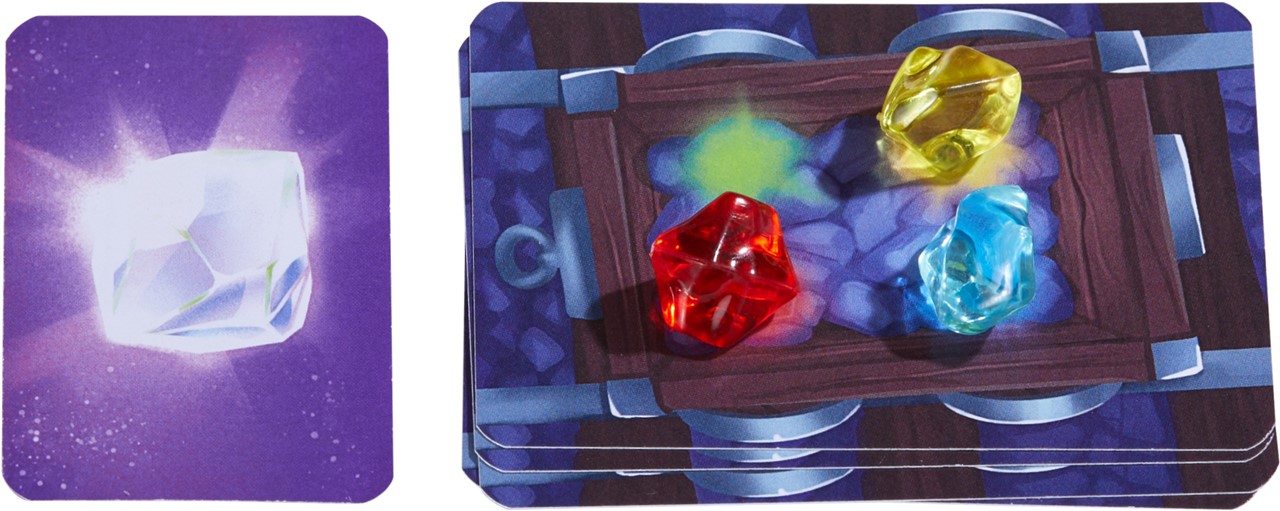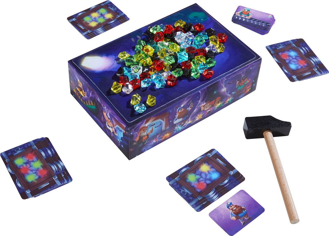 16 cartas de vagoneta, 9 cartas de tarea, 90 piedras preciosas, martillo, dado, estera adhesiva e instrucciones.