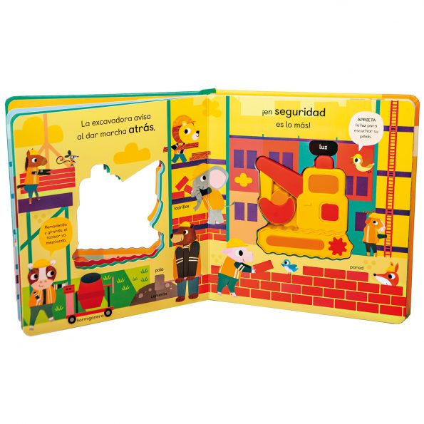 Una excavadora con mecanismos sonoros recorre los escenarios de una obra de construcción donde encontrará a los trabajadores, otros vehículos como la grúa o el camión y herramientas como el taladro o los ladrillos. A los niños y a las niñas les encantará apretar las partes blandas de esta excavadora para escuchar los sonidos de la luz giratoria, de las ruedas ¡y hasta del motor!