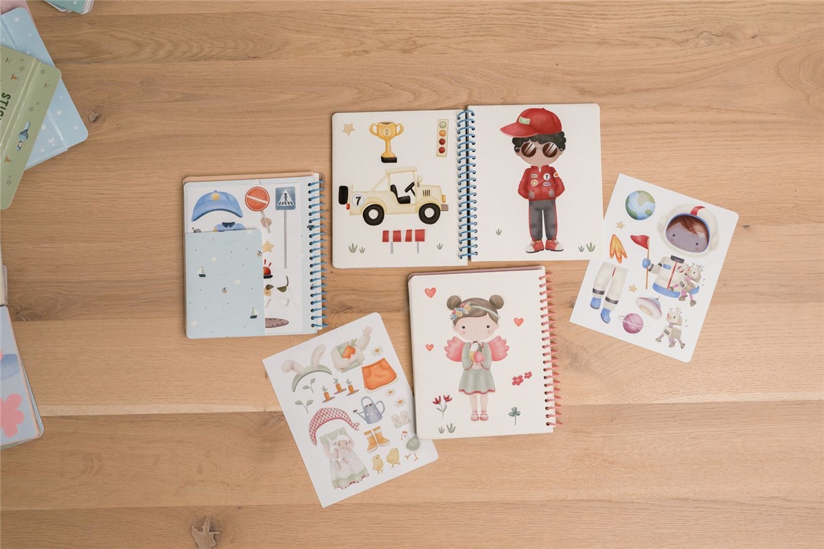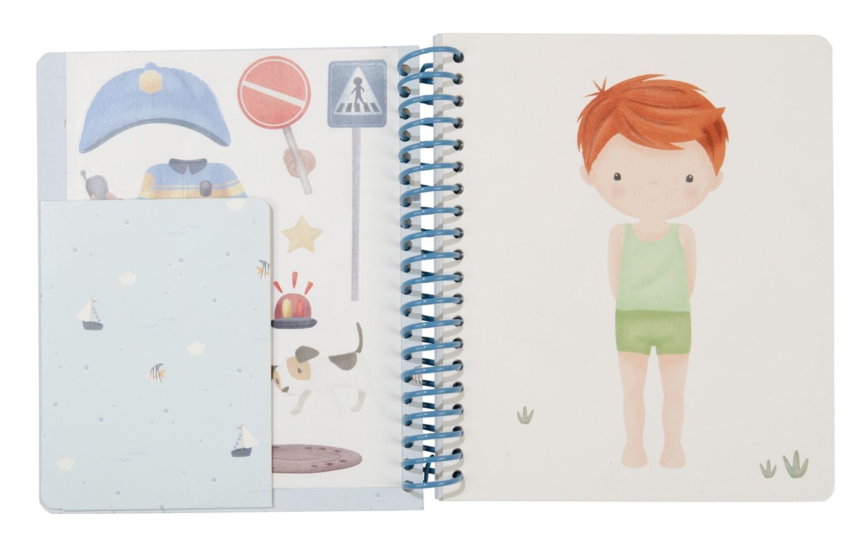 Libro vista a Jim & Friends con anillas. Contiene 24 páginas con modelos y 12 hojas de pegatinas con atuendos y accesorios. Con tapa dura, ideal para jugar en casa y para llevar.