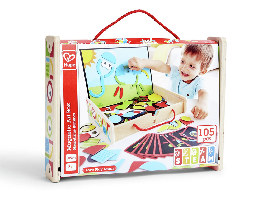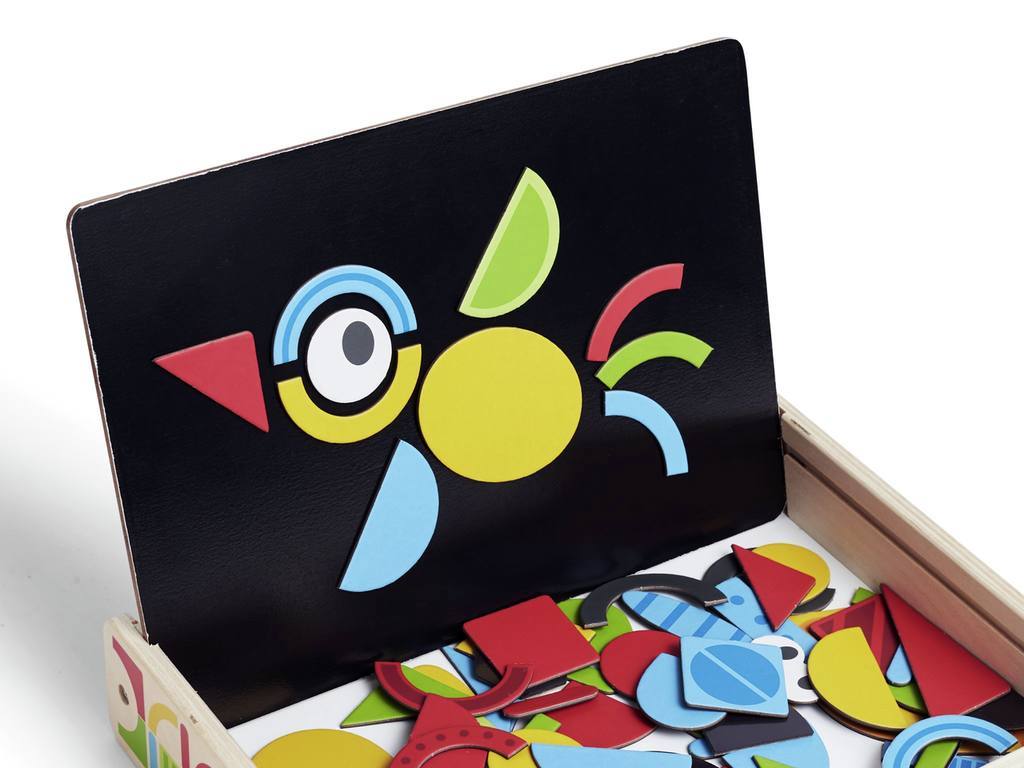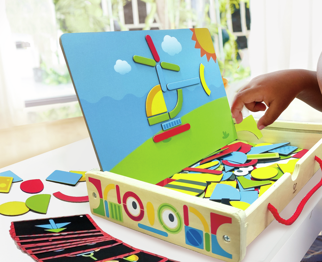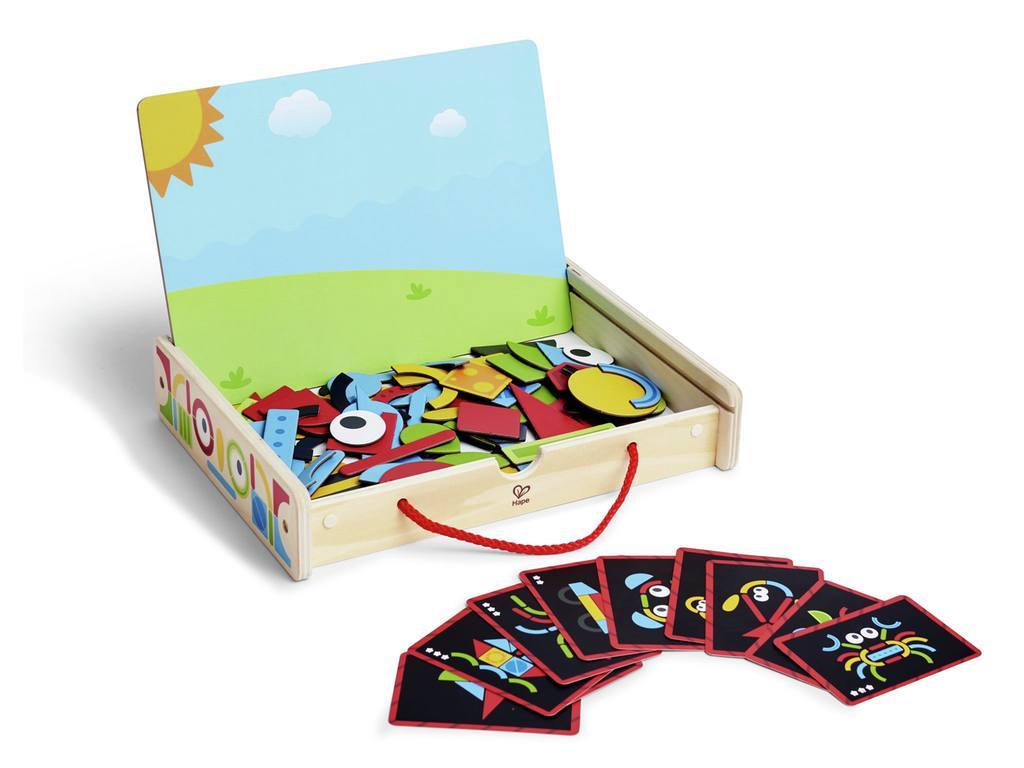 • Caja de madera con 91 formas magnéticas y 12 tarjetas inspiradoras.