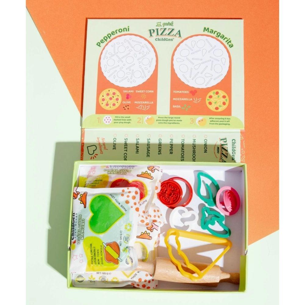 Juego para modelar PIZZA. Su divertida caja con diferentes modos de juego, rodillo de madera, 6 moldes y 5 bolsas de plastilina natural con cierre zip, en color rojo, blanco, verde, amarillo y morado te harán disfrutar de una actividad divertida y educativa.