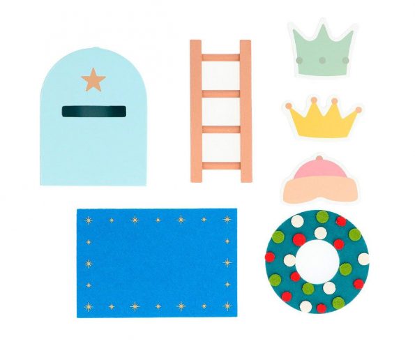 • Incluye: buzón mágico, escalera, corona puerta, 3 coronas reyes magos, alfombra