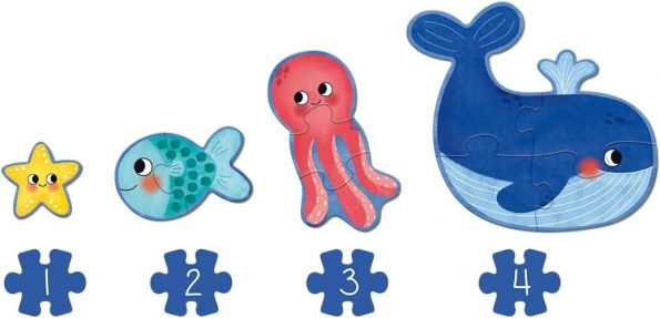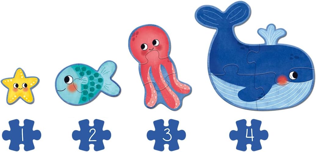 Une las piezas y descubre una escena inspirada en el océano mientras los niños desarrollan su capacidad de observación, la coordinación ojo-mano, la motricidad fina y el pensamiento lógico. Ideal para aprender jugando.