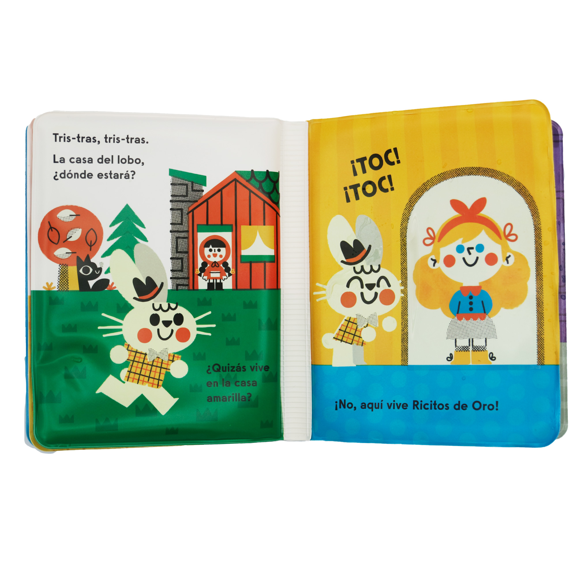 populares. Para encontrarlo, el conejito llama a la puerta de Ricitos de Oro, de los tres cerditos y de Caperucita Roja. Un libro de baño ilustrado por Pintachán, con elementos escondidos que quedan al descubierto cuando se mojan.