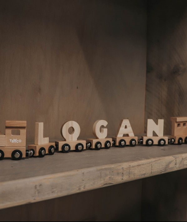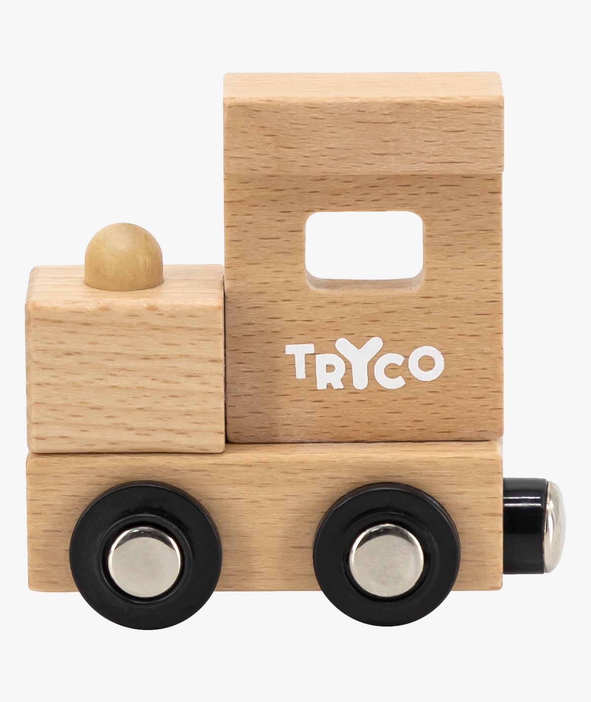 El tren de letras de madera imantadas Tryco es un juguete educativo y decorativo que permite a los niños y niñas formar su nombre o palabras uniendo letras como si fueran los vagones de un tren.