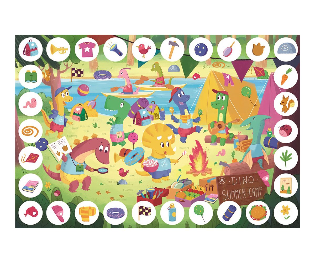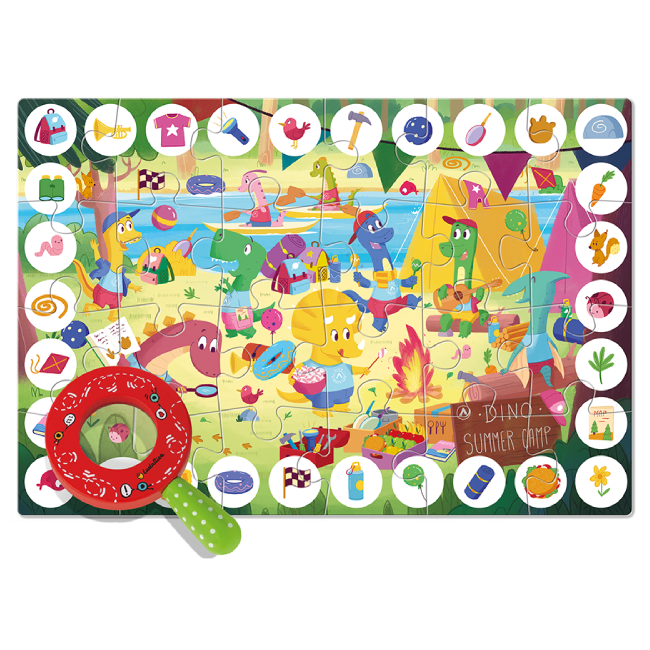 Versión adaptada a niños y niñas a partir de 3 años de los Detective Puzzle. Al terminar el puzzle, ¡la diversión continúa con un juego de detectives! Con la lupa especial de madera se deben encontrar en la ilustración central los objetos representados en el borde del puzzle. ¿Habéis visto lo bien que se lo están pasando estos divertidos dinosaurios en el campamento de verano?